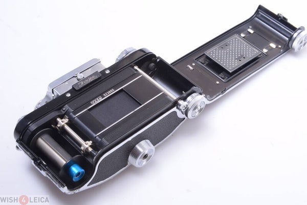 Camera shows minor signs of prior use and is overall in very good, minty condition. Shows minor scuffs, no scratches, no dings, no dents and minor paint rub off. Shows no wear on the cover. Ground glass, mirror in very good condition. Shutter works at all speeds, B & T settings work. Longer speeds also accurate. Shutter first blinds in light leak free condition. Film winds on smoothly. Comes with film take-up spool.
