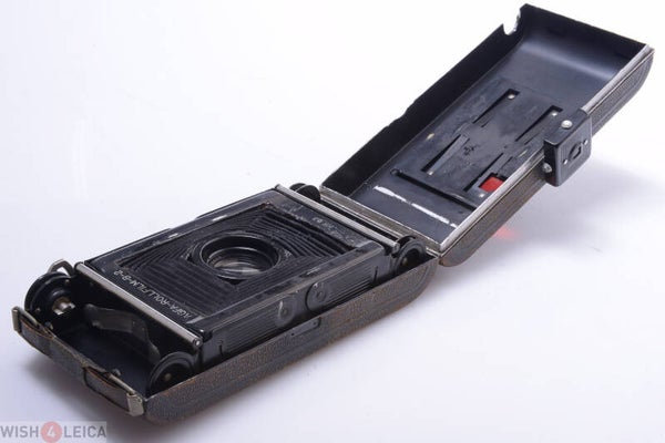 Camera shows some signs of prior use and is cosmetically overall in good condition. Shows some scuffs marks, no scratches, no dings, no dents, some wear, shows some paint rub off. Focus turns smooth. Aperture and speed setting move smooth. Blades open and close smooth. Cover shows some wear. Camera shows minor superficial corrosion. Camera opens perfectly and smooth. Bellows in light leak free condition.