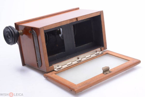 Viewer is overall in very nice condition, with some signs of prior use. Shows no repairs. Shows no cracks on the lens unit board. The cup is in good condition show no cracks. The lens is in good condition, no cracks and clean, shows no glass chip off. Shows minor scuff marks, few dings and minor small scratches on the wood, but really not that much. The original lacquer is shiny and bright. Nice 45-107mm viewer. Focus operates smoothly. Elements and ground glass are original and clean.
