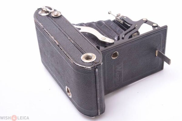 Camera in nice condition. With wear on the metal of the camera, mostly at the back. The nickel plated parts are in good condition showing some corrosion. No dents, some small dings, some scuff marks and some small scratches. The cover is in good condition and nothing missing, shows wear. Shutter works pretty accurate on all shutter speeds, longer speeds also. B & T setting work. Shutter blades in good condition, show wear. Winds smooth.