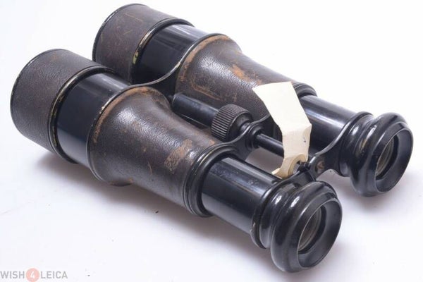 Brass binoculars are in good condition. All brass. Eye-cups are 25mm wide, much wider than similar binoculars. Shows signs of prior use. Shows dings, one small dents, some paint wear and shows some scratches to the metal parts. Hoods slide smoothly and stay in place. Leather cover is complete and shows wear. Hood cover is somewhat less old, probably replaced at a later date, but both types of leather are the same. The elements are in good condition, no separation, no haze, no cleaning marks, no scratches, no fungus on or in between the elements. Some dust particles inside. Eye-cups in good condition, shows few dings. The focus ring turns smooth. Size is 204x132x66mm.