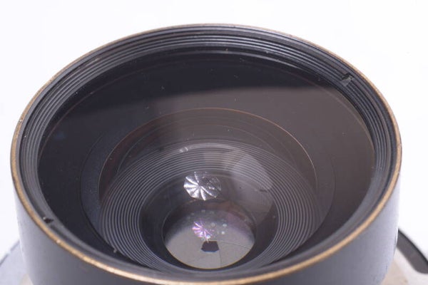Lens barrel shows minor signs of prior use and is in very good condition. Shows minor scuff marks, no scratches, no dings, no indentations, no paint rub off. Aperture setting moves smooth. The elements are in very good condition. No cleaning marks, no scratches, no haze, no fungus, no separation. Shows no dust particles inside. Aperture blades show minor wear and are clean, open and close perfectly smooth. Needs a 33mm hole lens board. Comes with rear cap.