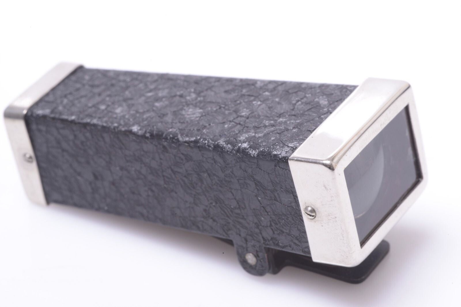 Nickel plated front and rear. Beautiful condition.Looking through the finder is shows a 35mm frame, and very bright blue colored view. It can be clipped on. For what camera or what brand it is it doesn't say.Finder is in very good condition. On the outside no rub marks, no scratches, no dings, no dents. View shows no hazed and very bright. A very good usable finder.