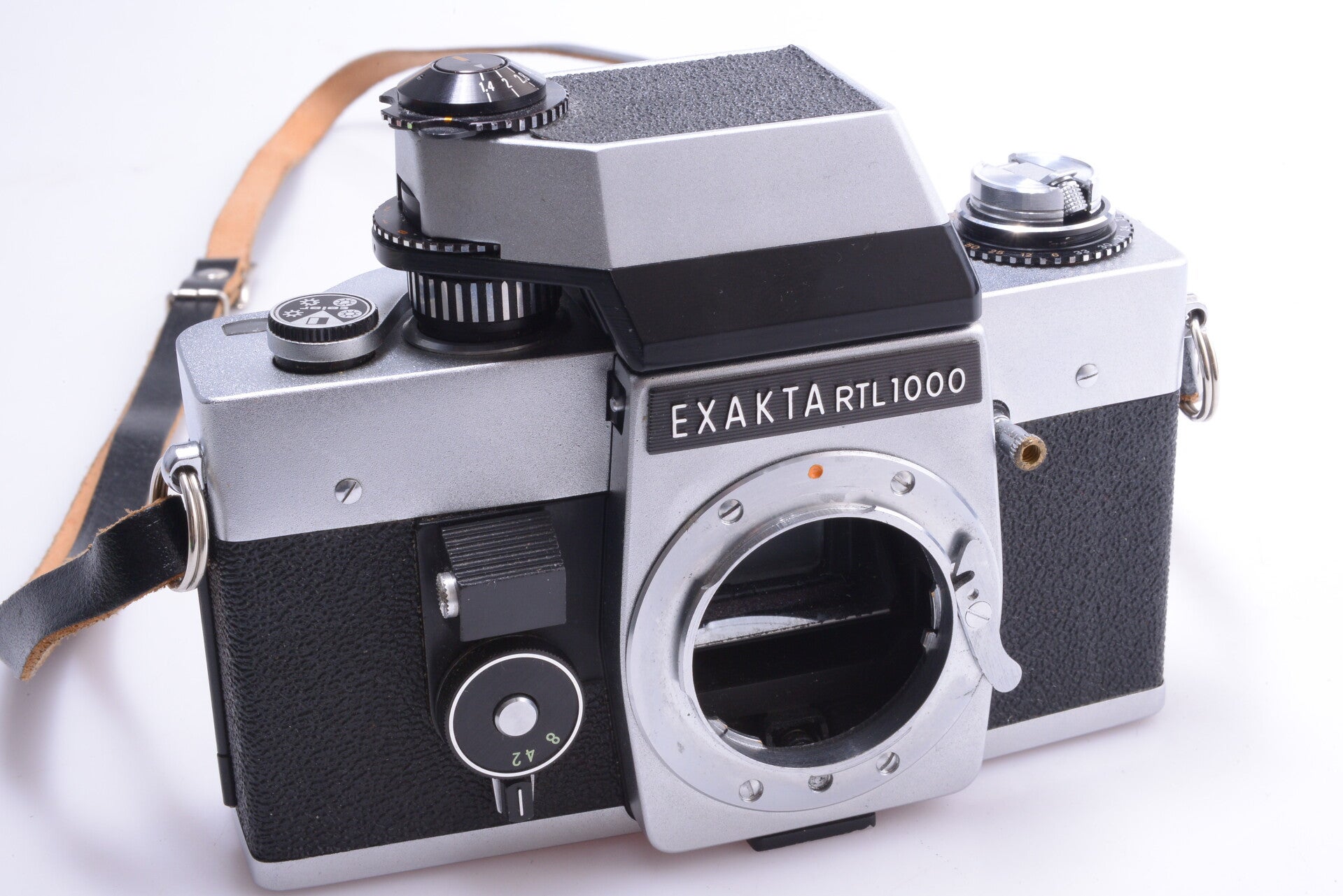 EXAKTA RTL1000 35MM SLR CAMERA NO LENS W/ STRAP & LIGHT METER PRISM