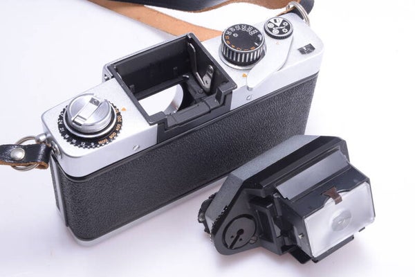Camera shows some signs of prior use and is overall in good condition. Shows only some wear at the bottom due to tripod use. Otherwise it shows no scuffs, no scratches, no dings. No wear at the cover. Focus screen and mirror in very good condition. Film winds on smoothly. Camera comes with original leather strap.