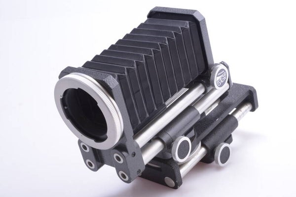 The bellows is in very good condition. Shows some signs of prior use. Shows no dings, no dents, minor scuff marks, some small scratches. Bellows is light leak free and moves solidly smoothly over the rail. Thread and bayonet are in perfect condition. Locks all work well.