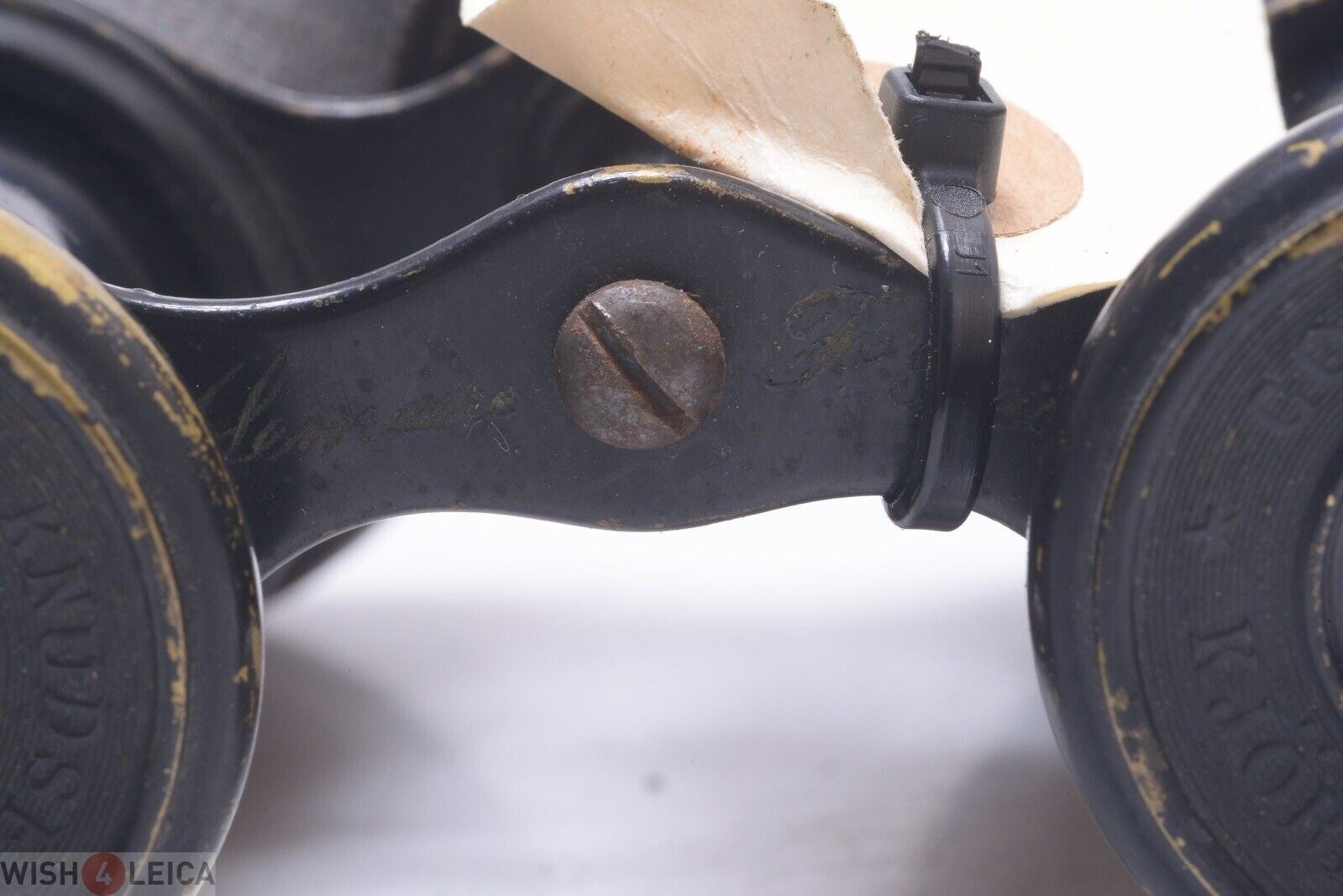 Brass binoculars are in good condition. Shows signs of prior use. Shows dings, no major dents, paint wear, and shows some scratches to the metal parts. Leather cover is complete and shows wear, shows bumps underneath the leather. The elements are in good condition, shows separation at the left hand side front element, no haze, minor cleaning marks, no scratches, no fungus on or in between the elements. Some dust particles inside. View is bright. Eye-cups in good condition. Clear readable at the eye-cups is ‘ Cornelius Knudsen Kjobehavn’. The focus ring turns smooth. Size is 95x108x47mm.