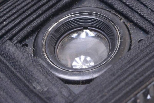 The camera is overall in very nice condition. Camera shows some wear at the body, minor scuffs, minor scratches, a few dings, no dents and minor paint loss. Camera opens with ease. Original bellows in good light leak free condition. The lens elements are in good condition. Shows no cleaning mark, slight haze, one fungus spot, no separation, no scratches, no scuffs marks. Lens/bellows unit moves smoothly over the guide rails, clicks nicely in place. Focus turns smooth. Waist level finder image is bright and clean. Very nice ready to use camera.