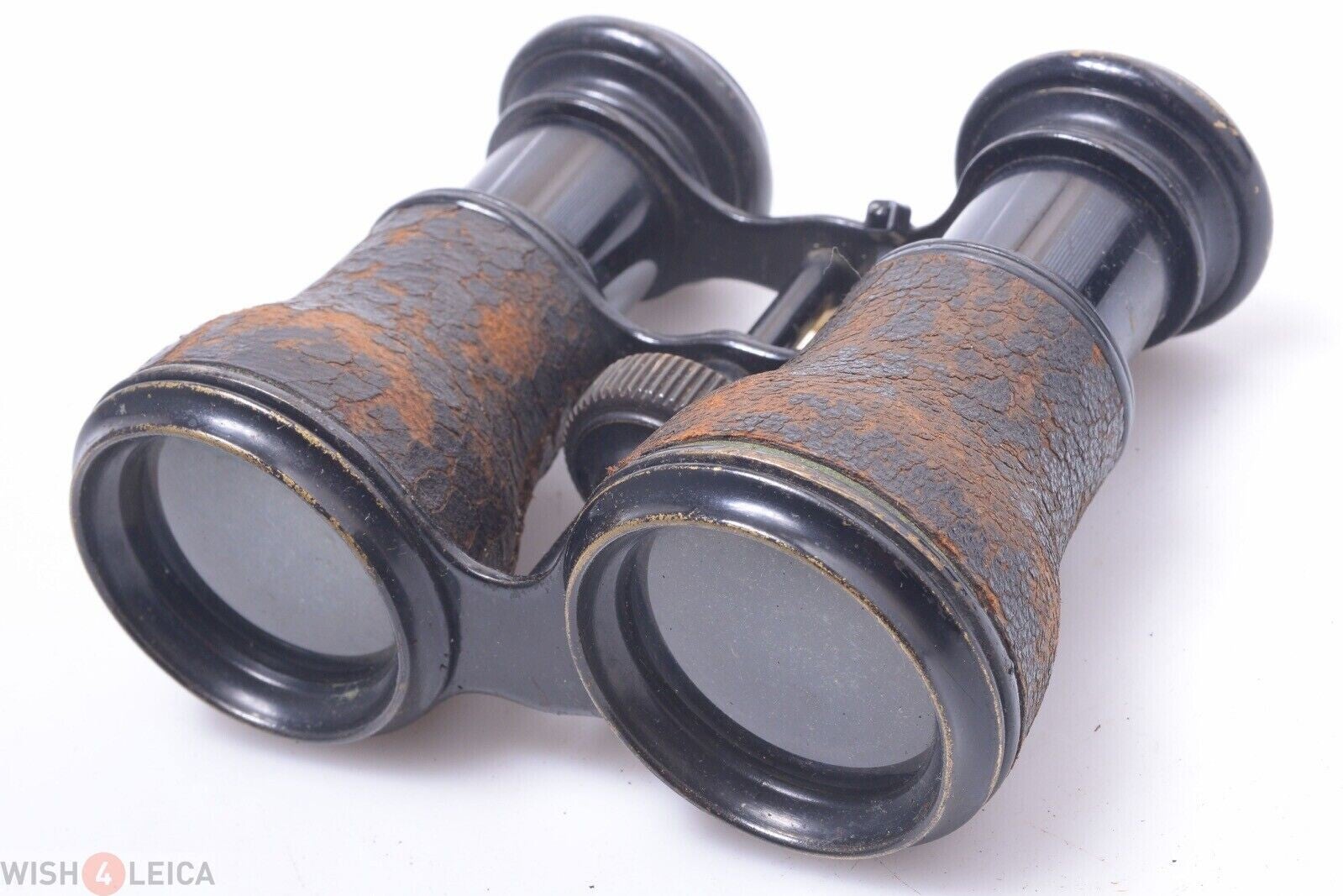 Binoculars are in overall good condition. Shows signs of prior use and no corrosion. All brass and metal. At the metal parts it shows some superficial corrosion. Shows no dings, no dents, and shows some scratches. Cover is complete and original, shows wear and is dry, but doesn’t peal off. The elements are in good condition, no separation, no haze, no cleaning marks, no scratches, no fungus on or in between the elements. Shows edge smudges and shows dust particles inside. View is bright. Eye-cups in good condition, shows no dings. The focus ring turns smooth.