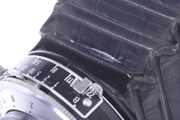 Finder is bright and clean. Shutter stuck in cocked position. Bellows in light leak free condition, show a small repair.