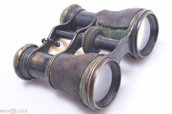 Binoculars are in overall fairly good condition. Shows signs of prior use and no corrosion. All brass. At the metal parts it shows some superficial corrosion. Shows no dings, no dents, and shows some scratches. Cover is complete and original, shows wear and is dry, but doesn’t peal off. Loose at the edges. The elements are in fairly good condition, show edge separation at the left hand side front, no haze, no cleaning marks, no scratches, no fungus on or in between the elements. Shows edge smudges and shows dust particles inside. View is bright. Eye-cups in good condition, one shows slight indentation. The focus ring turns smooth.