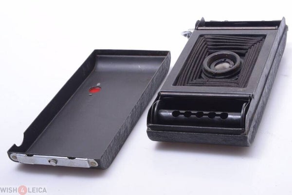 Camera shows minor signs of prior use and is cosmetically overall in very good condition. Shows some scuffs marks, no scratches, no dings, no dents, some wear. Finder in pretty clean condition. Lens unit and bellows pull out smoothly. Aperture moves smooth. Focus moves smooth. Camera shows minor superficial corrosion. Camera opens perfectly and smooth. Bellows in light leak free condition.
