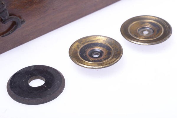Microscope comes with all items shown in the pictures. Lenses are in good condition. Mirror one sided in good condition, edge de-silvering spots. Focus works. Comes in the original wooden case. Case shows no cracks.