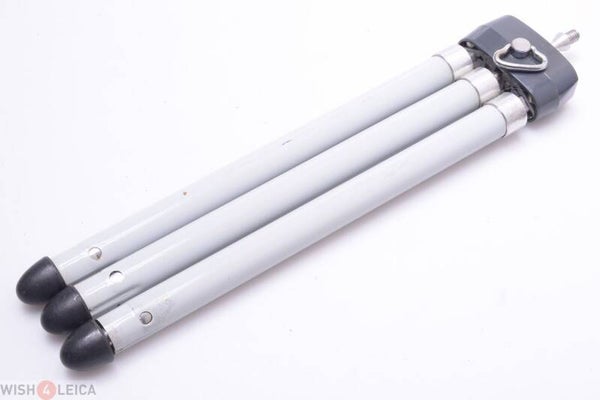 Very nice small and handy tripod. Weighs approx. 0.6kg complete. For compact cameras only. More sturdy when minimum height is used. The round small plate at the top is missing.