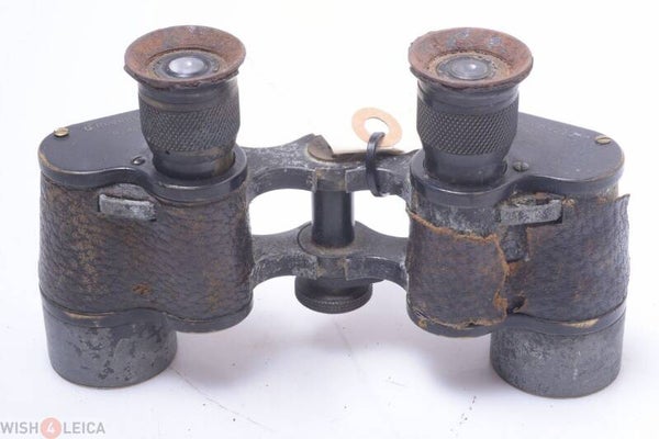 The binoculars in fairly good condition and not repainted. Shows some dings, paint loss, no dents and shows scratches to the metal parts. The elements are in good condition, are not well collimated, no separation, no haze, no cleaning marks, no scratches, shows fungus strands and patches. Both prisms are in good condition. Dust particles inside. View will be enhanced once completely cleaned. Still a sharp image. Original leather cover is missing large pieces at the right hand side. Comes without strap.