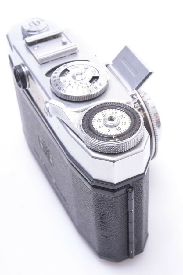 Shutter works accurate in conjunction with the light meter at all speeds and settings. Sticker at the rear. Note the coating and front element problems. Light meter works and is accurate.