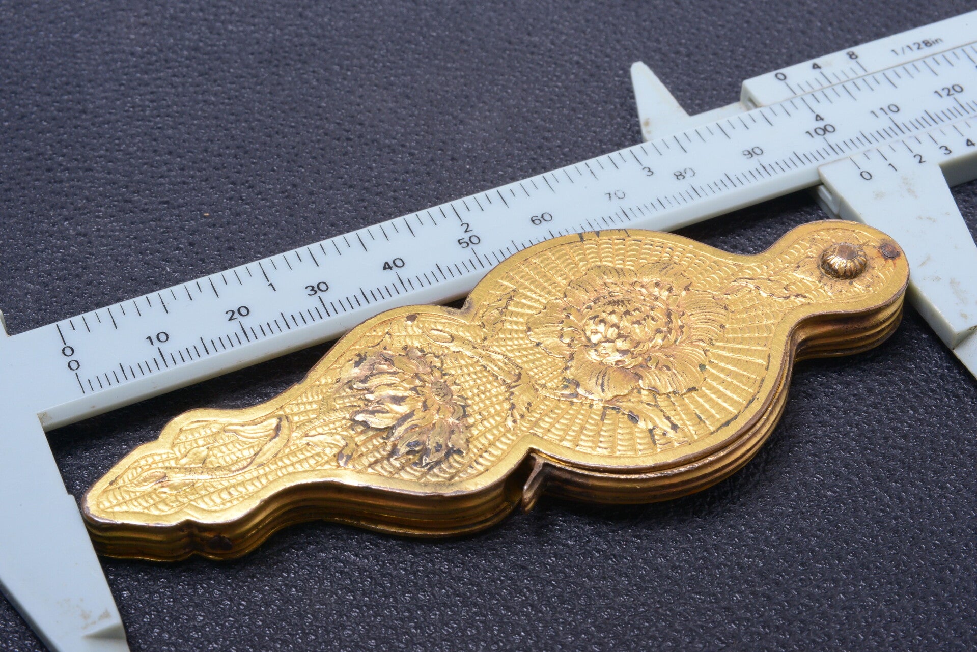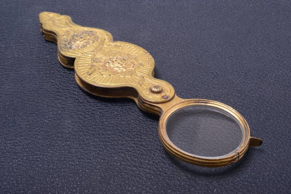 Monocle element glass unfold nicely and needs to be done by hand. Ornate floral motif handle. I don’t think it is gold filled.