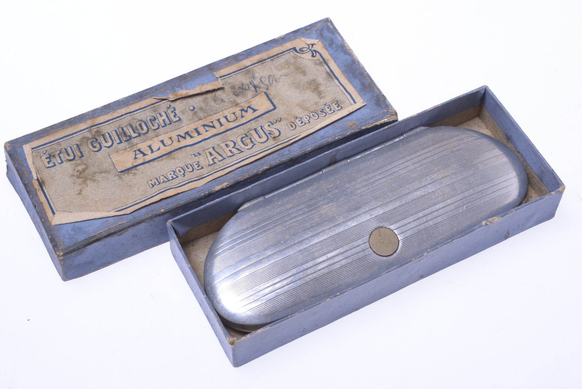 Aluminum shows some aging. Never used and comes with original makers box. Box shows wear and 3 corners torn. Clamp shell case has felt on the inside in new condition.