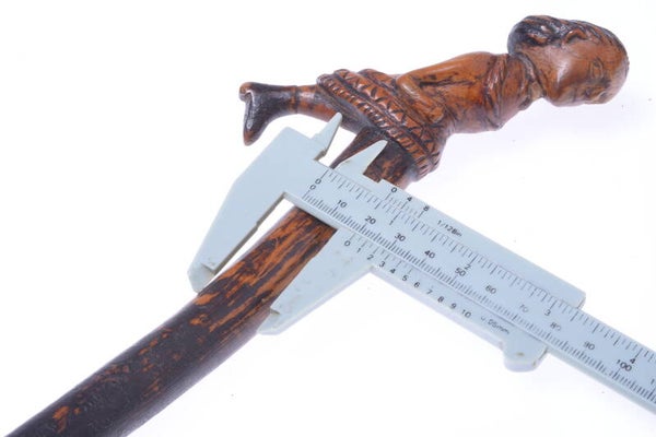 A real nice walking stick. Handle feels very good. It is 67.5cm, 26.57” in length. Nice cane, light weight. Weight is 157Grams, 5.55oz. C. 1930. Handle shows no dings, no cracks, some scratches, some scuffs. A very nice example.