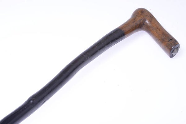 Shows some signs of prior use and is in good condition. Shaft shows minor scuffs and scratches, no cracks. Lacquer in good condition, shows wear. Has a thimble for a tip and a light weight sturdy wood shaft. Shaft clearly is an ebonized branch.