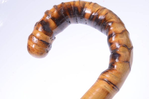A real nice walking stick. Handle feels very good. It is 89CM 35.03” in length. Nice cane, light weight. Weight is 442Grams, 15.55oz. C. 1930. Handle shows few dings, no cracks, some scratches, some scuffs.