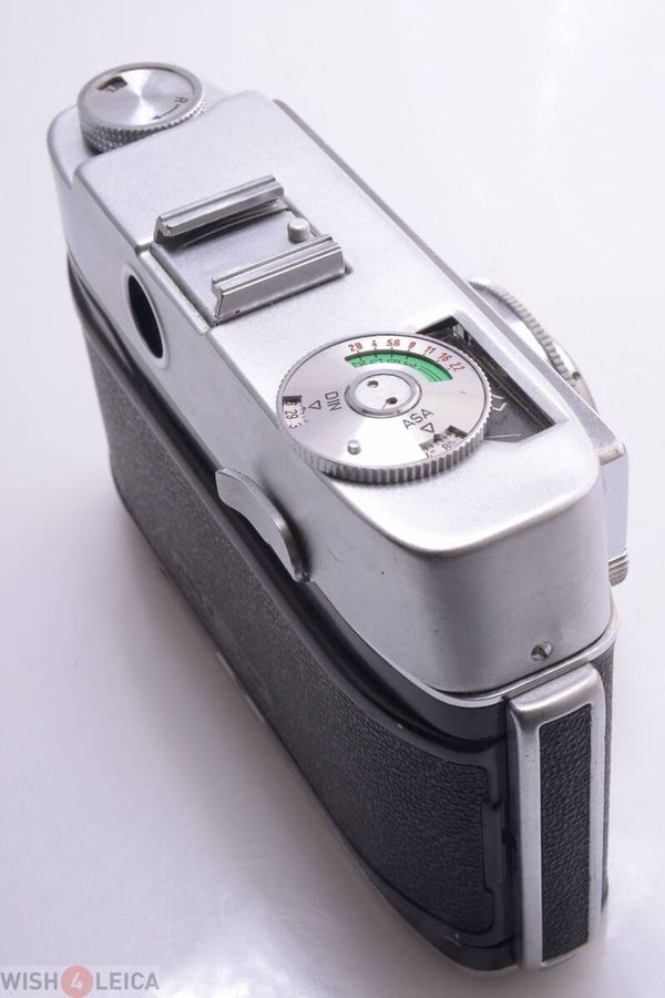 Camera is overall in good condition with some signs of prior use. No wear on the leatherette. No dents, no ding, no scratches at the top on the camera. Show some paint wear at the film door. Bottom plate shows some wear. Adjusting the shutter speeds and aperture is smooth. Aperture blades in good condition. Lens elements are in very good condition. Show no cleaning marks, no scratches, no fungus, no separation, no haze. Lens focus turns smooth. The original cover doesn’t mis a piece. Finder is fairly bright, slight cloudiness. Very nice classic 35mm camera.