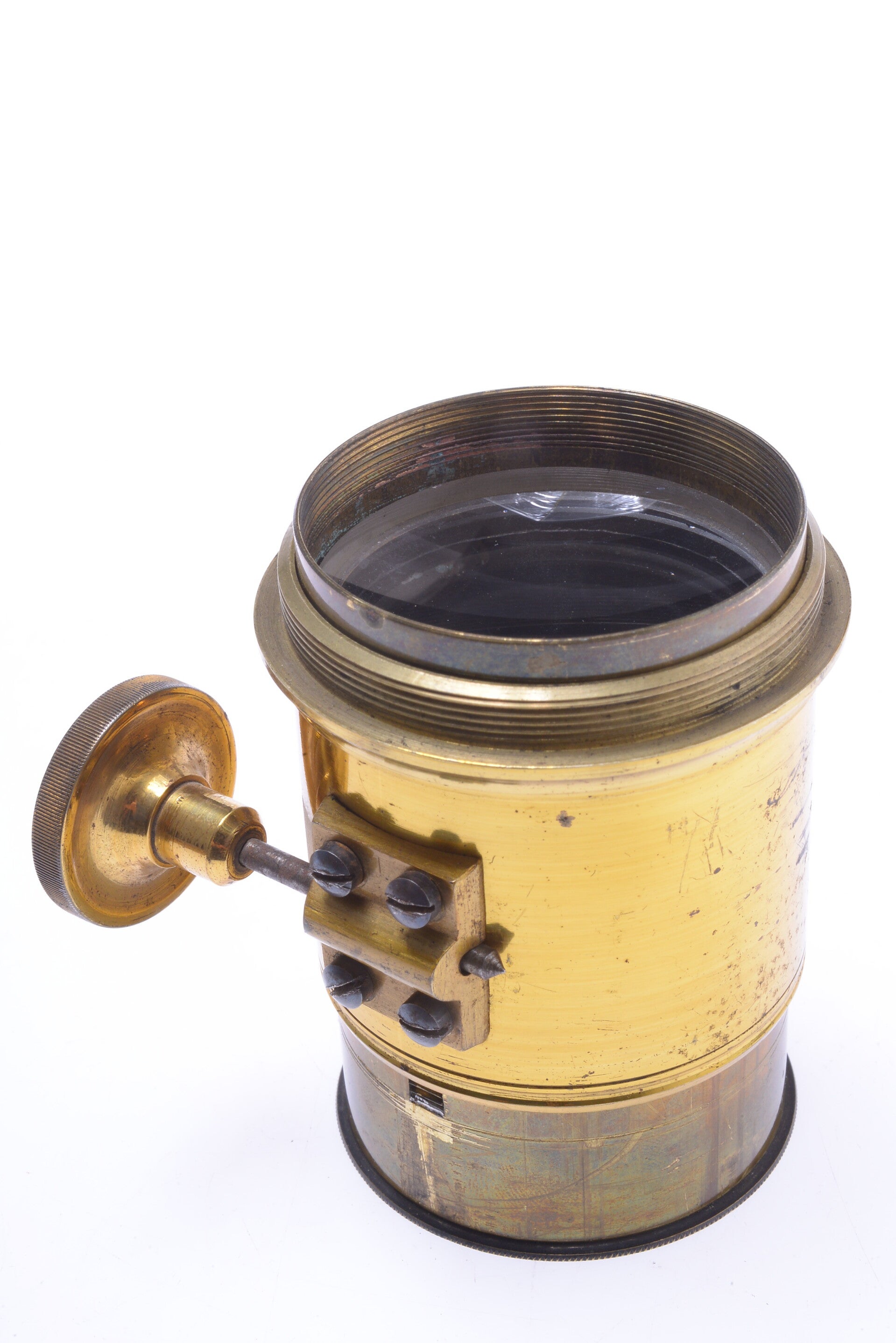 The barrel and rack & pinion are cosmetically and mechanically in good condition. Rack & pinion works perfectly smooth. Barrel shows some signs of prior use. Barrel shows no dings, no dents, some tarnishing, some scuff marks and scratches. The element is in very good condition. Shows no cleaning marks, no scratches, no haze, no fungus, no separation. Comes without flange. Has 57mm thread and the inner diameter of the barrel is 50mm.