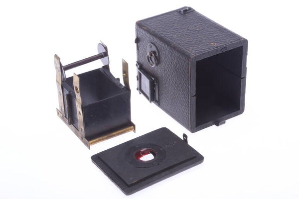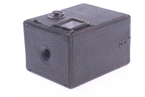 Shutter works and speed is accurate. T setting works, one aperture value setting. Early 3.5x5cm box camera. Shows some similarities to a The Pocket Kodak Box camera. Cover has the same grain, winder at the top, exactly the same winder spool, same film size102 roll film.