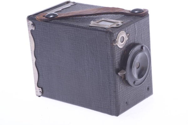 Shutter doesn’t work, name plate missing and doesn’t have a lens. Camera is in nice condition and has a very nice focus screen. Sold under numerous names and brands.