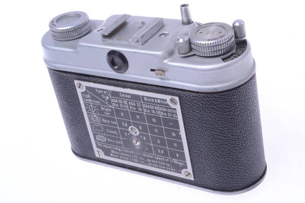 Camera shows some signs of prior use and is in very good condition. Shows no scuffs, no scratches, no dings, no dents, some chrome rub off at the top of the lens housing(see pictures). No wear at the cover. Finder in good and bright condition. Film winds on smoothly. Comes with take-up spool.
