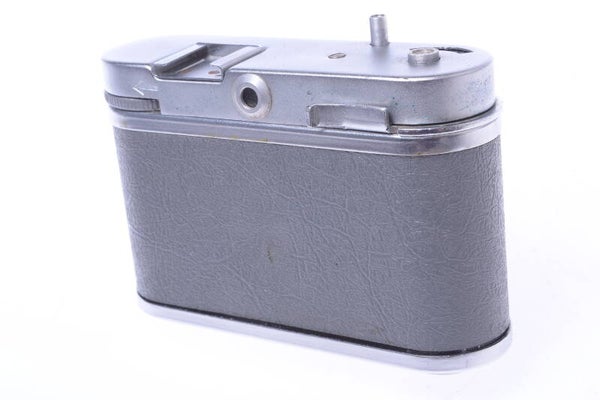 Camera shows some signs of prior use and is in good condition. Shows minor scuffs, few tiny scratches, no dings, no dents, no chrome loss. No wear at the cover. Finder in good and bright condition. Film winds on smoothly. Comes with original take-up spool.