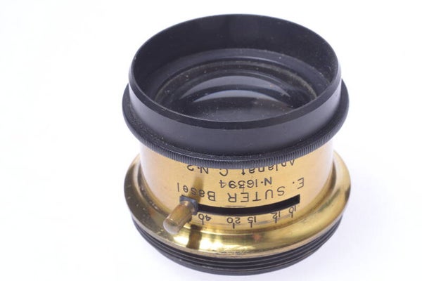 The lens is a Suter Aplanat No.2 C model and in very good condition. Lettering is bright and clean. Shows no dings, no dents, no paint rub off at the front, no scuff marks and no scratches. The elements are in very good condition. No cleaning marks, no scratches, no haze, no fungus, no separation. Shows no dust particles inside. Aperture blades show some wear and are clean. Aperture open and close perfectly. Camera comes in case with also a Swedish provenance. Very rare and very nice conditioned camera.