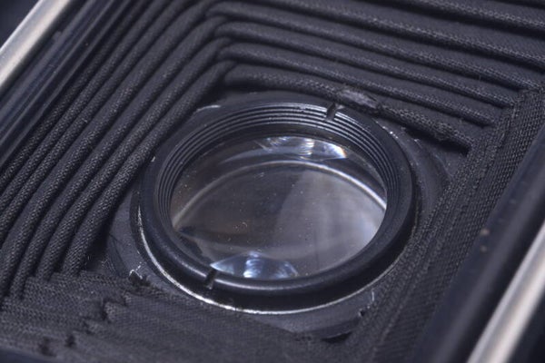 Camera shows some signs of prior use and is in good condition. Shows some scuffs, some small scratches, some paint rub off, few small dings, no dents. Finder is in good condition. Bellows pulls out with some difficulty. Bellows is light leak free. Focus turns very smooth.
