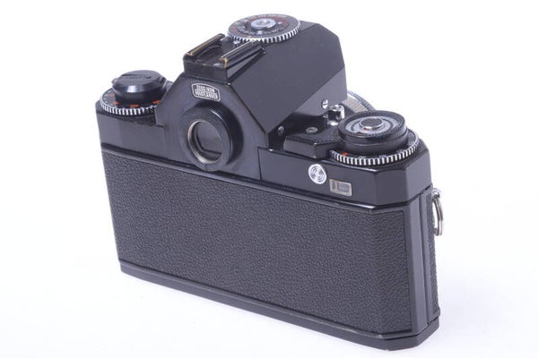 Camera shows some signs of prior use and is in good condition. Shows minor scuffs, no scratches, few tiny dings, no dents. Shows some paint wear at the black painted metal parts. Minor wear at the cover. Focus screen and mirror in very good condition. Film winds on smoothly.