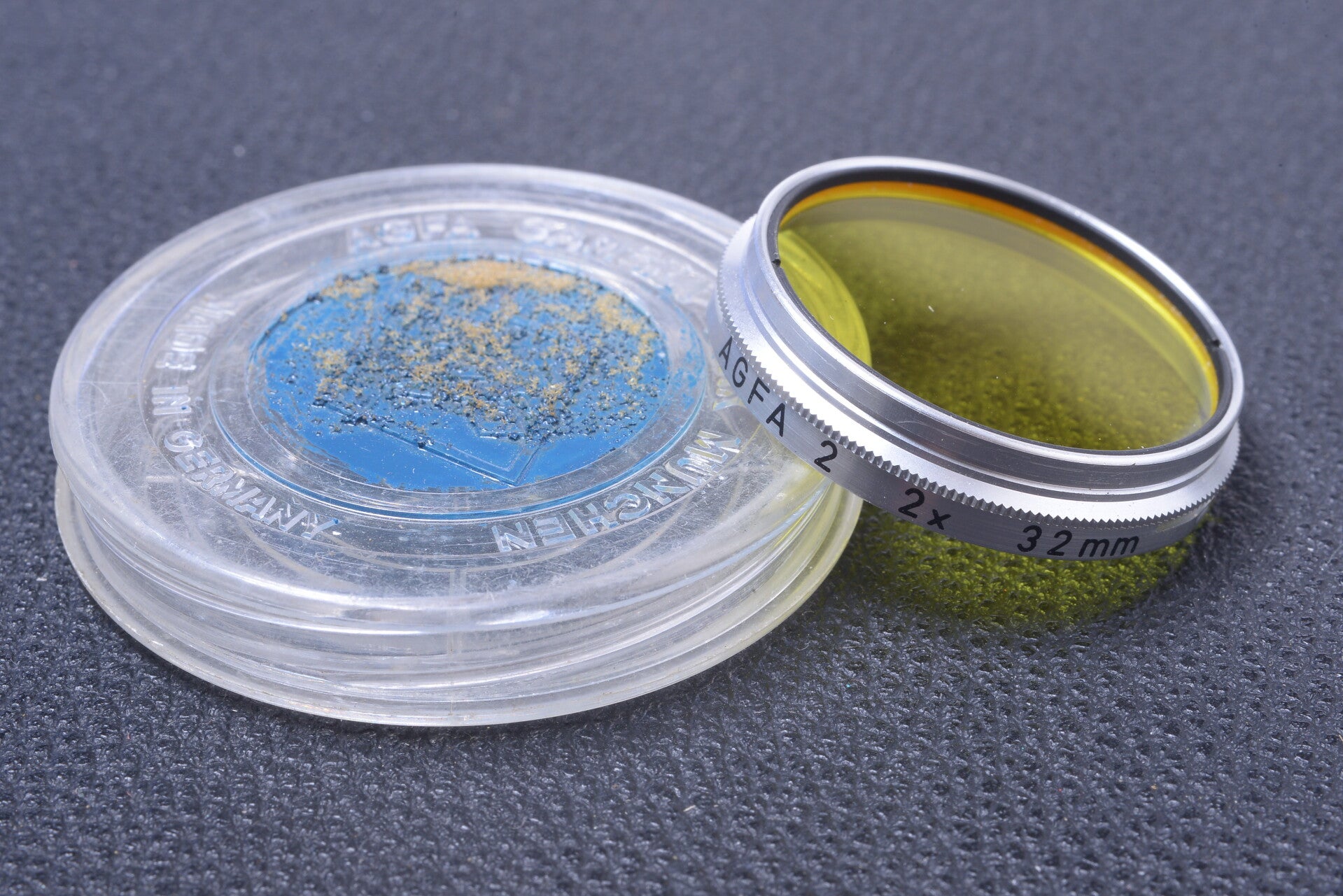 AGFA YELLOW 2X 32MM FILTER GENUINE LENS OR CAMERA PUSH ON W/ KEEPER 107-2